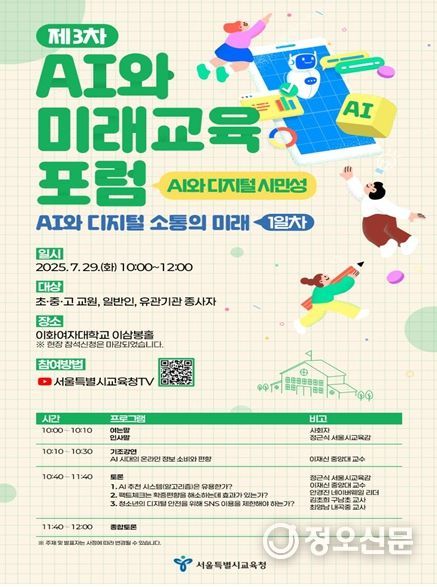 정오신문 관리자 기자 | 서울특별시교육청은 오는 7월 29일부터 30일까지 이틀간 '제3차 AI와 미래교육 포럼'을 개최한다.