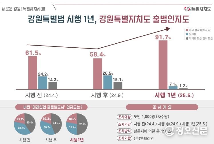 조사 결과, 강원특별자치도 출범에 대한 도민 인지도는 시행 전에는 매우 잘 알고 있거나 대체로 알고 있다고 응답한 비율이 61.5%였으나 시행 1년 후 91.7%로 크게 상승한 것으로 나타났다.