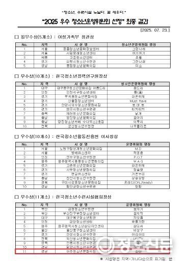 시상식은 오는 8월 27일 '2025 전국 청소년운영위원회 청소년대표자 워크숍' 개회식과 함께 진행될 예정이다.