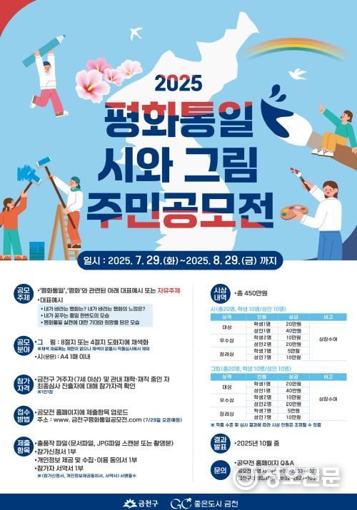 정오신문 관리자 기자 | 금천구는 ‘2025 평화통일 시와 그림 주민공모전’을 연다고 밝혔다. 8월 29일까지 공모전 전용 누리집을 통해 공모전에 참가할 수 있다.