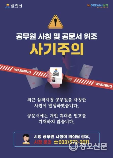 정오신문 주재영 기자 | 삼척시는 최근 시청 공무원을 사칭한 보이스피싱 사례가 관내에서 잇따라 발생함에 따라, 시민들의 피해 예방을 위해 각별한 주의를 당부했다.
