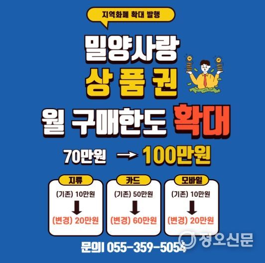 정오신문 관리자 기자 | 밀양시는 지역경제 활성화를 위해 밀양사랑상품권의 월 구매 한도를 8월 1일부터 기존 70만 원에서 100만 원으로 확대한다고 밝혔다.