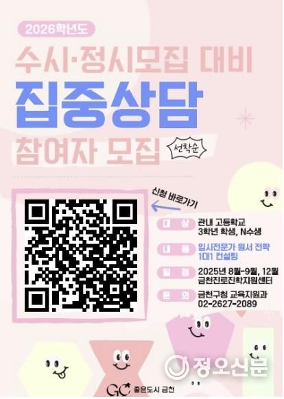 정오신문 관리자 기자 | 금천구는 2026학년도 대학입시를 앞두고 8월부터 수시모집 대비 일대일(1:1) 집중상담에 들어간다고 밝혔다.