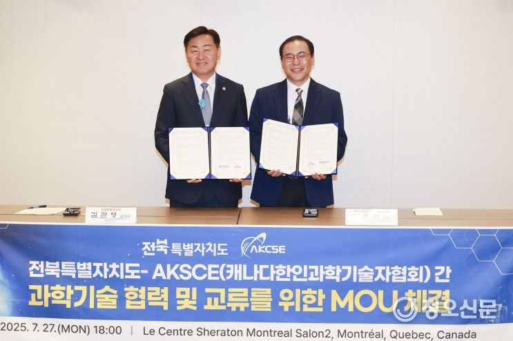 AKCSE는 캐나다 전역에서 활동 중인 한인 과학기술자 3천여 명이 소속된 전문가 조직으로, 현지 첨단 기술 동향과 연구 인프라를 폭넓게 보유하고 있다. 전북은 이번 협약을 통해 북미 지역과의 R&D 연결고리를 확보하고, 지역 기반 연구기관 및 기업의 기술경쟁력 강화를 위한 국제 교류를 본격화할 방침이다.