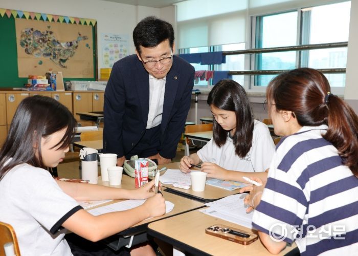 윤건영 충청북도교육감은 30일, 한여름 폭염에도 불구하고 초등 여름방학 학력도약 교실을 운영하고 있는 강서초등학교(교장 엄재화)를 방문해 5, 6학년 학생 38명과 교직원을 격려했다.