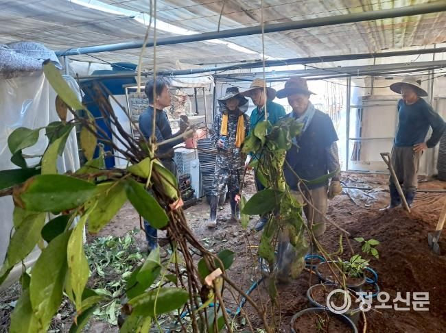 정오신문 관리자 기자 | 합천군귀농인협의회는 29일 오전 6시부터 12시까지 용주면 황계리 산사태로 인하여 피해를 입은 흑노호 재배농가에 회원 30명이 참석하여 흑노호 이식 및 매몰된 하우스를 복구했다.