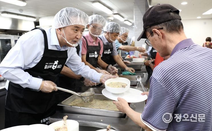 김 지사와 봉사자들은 중복을 맞이하여 경로식당 이용 190여 명의 어르신들을 대상으로 삼계탕 배식 봉사활동을 하며 무더위 대비 안부 인사를 전했으며 배식 봉사활동 후 이뤄진 점심 자리에서 어르신들의 애로사항 청취 및 대화의 시간을 가졌다.