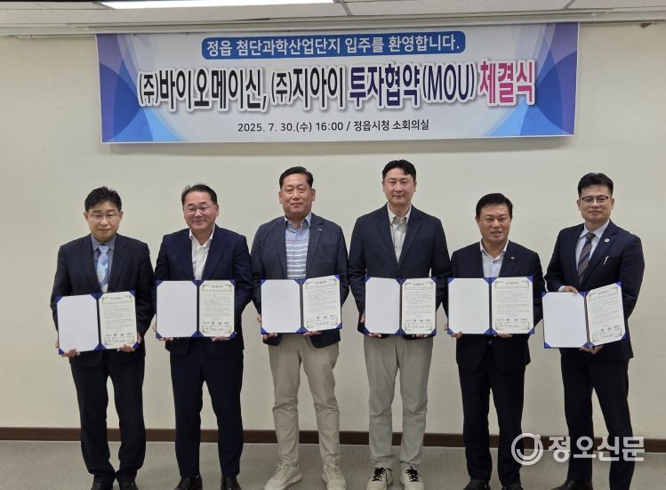 도와 정읍시는 30일 정읍시청에서 ㈜바이오메이신과 ㈜지아이와 총 108억 원 규모의 투자협약(MOU)을 체결했다고 밝혔다.