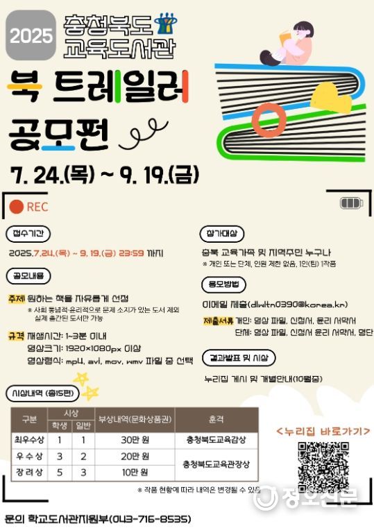 정오신문 관리자 기자 | 충청북도교육청 직속기관 교육도서관은 31일, 영상 콘텐츠를 통해 도서관 및 독서문화 활성화를 도모하기 위한 '2025년도 북 트레일러 공모전'을 운영한다고 밝혔다.
