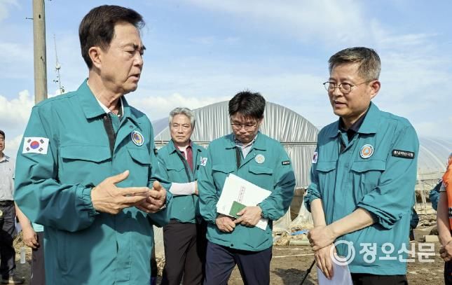 김태흠 지사는 30일 오후 수해 피해가 컸던 아산시 염치읍을 방문해 김범수 아산시 부시장과 함께 음봉천 제방 유실 및 침수 현장, 곡교1리 마을회관을 찾아 복구 상황을 점검하고 주민들을 위로했다.