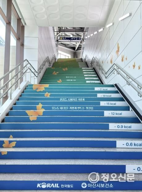 정오신문 관리자 기자 | 아산시가 시민의 일상 속 걷기 실천을 유도하고 건강한 도시환경 조성하기 위해 탕정역에 건강계단과 엘리베이터 옆 걷기 유도 안내판을 설치했다.