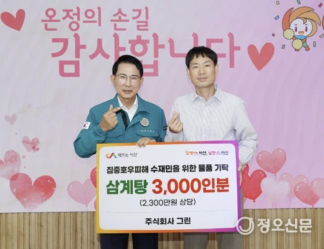 이완섭 서산시장은 “지역 사회를 향한 따스한 관심에 감사드리며, 이번 전달될 삼계탕이 집중호우로 피해를 본 시민에게 큰 위로가 되길 바란다”라고 말했다.