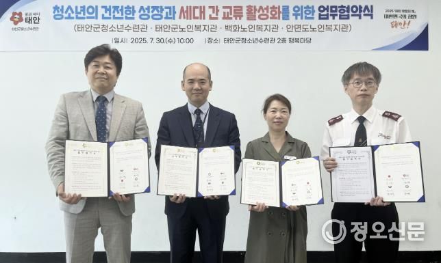 태안군은 지난 7월 30일 태안군청소년수련관 내 행복마당에서 수련관 관계자와 태안·백화·안면 노인복지관 관장 등 10여 명이 참석한 가운데 ‘태안군청소년수련관-노인복지관 3개소 공동 업무협약’을 맺었다고 밝혔다.