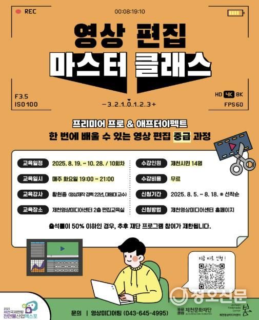 정오신문 관리자 기자 | 제천문화재단이 오는 8월 5일부터 영상 편집 중급반 [영상 편집 마스터 클래스]의 수강생을 모집한다.