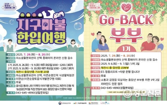 이번에 모집하는 프로그램은 ▲부부간 소통과 감정 회복을 돕는 1박 2일 부부 인문 캠프 'GO-BACK 부부' 1기와, ▲제천의 전통 떡 문화와 지역 음식의 철학을 체험하는 '지구마불 한입여행'이다. 두 프로그램 모두 제천시 중장년층을 대상으로 무료로 운영된다.