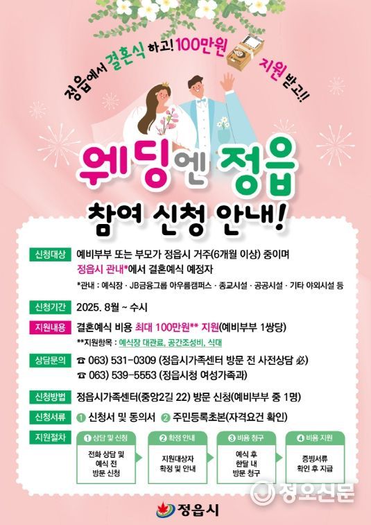 ‘웨딩엔 정읍’은 정읍에서 결혼식을 올리는 신혼부부에게 최대 100만원의 예식 비용을 지원하는 신규 시책으로, 생활인구 유입과 지역경제 활성화를 도모하기 위한 취지로 마련됐다.
