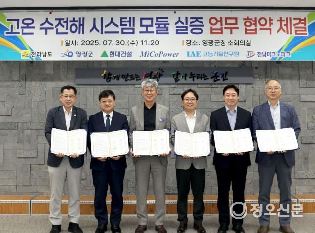 정오신문 관리자 기자 | 전라남도는 30일 영광에서 영광군, 전남테크노파크, 고등기술연구원, 현대건설㈜, ㈜미코파워와 100kW급 고온 수전해 시스템 모듈 실증 업무협약을 하고, 국내 최초 고온 수전해 실증을 본격화한다고 밝혔다.