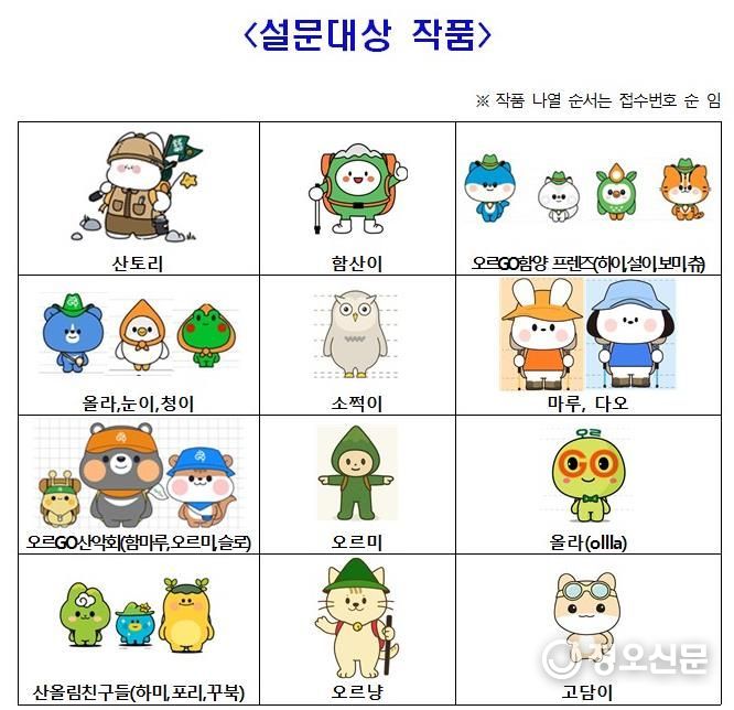 한편, 이번 선호도 조사 결과는 최종 심사에 활용되며, 2차 심사를 통해 금상, 은상, 동상 등 수상작이 8월 말 발표될 예정이다. 선정된 캐릭터는 ‘오르GO 함양’ 홍보물, 기념품 제작 등 다양한 분야에서 활용될 계획이다.