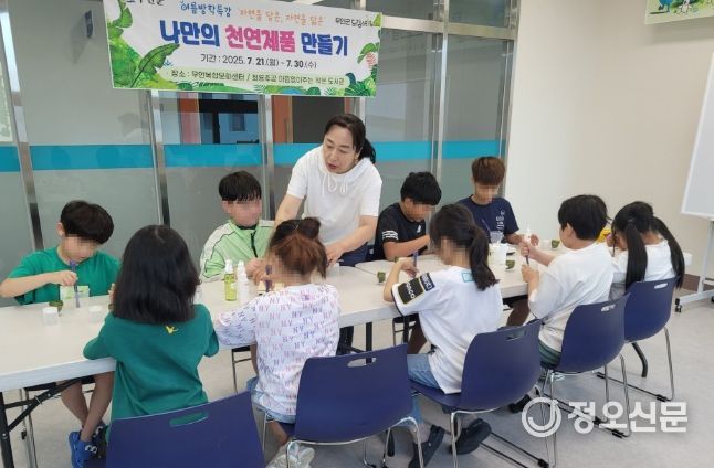 정오신문 관리자 기자 | 전남 무안군 드림스타트는 여름방학을 맞아 지난 21일부터 2주간 월요일에는 무안군 복합문화센터에서, 수요일은 남악회룡주공아파트 ‘아낌없이 주는 작은도서관’ 프로그램실에서 총 4회에 걸쳐 나만의 천연제품 만들기 프로그램을 운영했다.