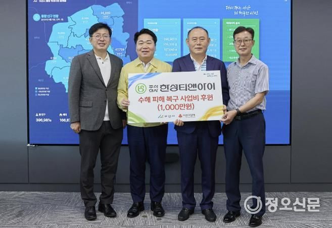 정오신문 관리자 기자 | 아산시가 ㈜한성티앤아이로부터 집중호우로 인한 수해 피해 복구를 위한 후원금 1,000만 원을 전달받았다.