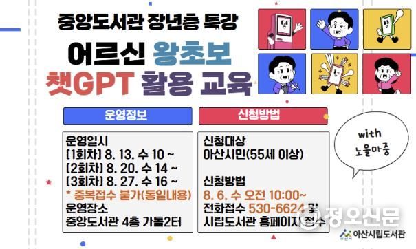 정오신문 관리자 기자 | 아산시가 오는 8월 13일부터 27일까지 매주 수요일 중앙도서관에서 어르신을 위한 ‘왕초보 챗GPT 활용 교육’을 운영한다.