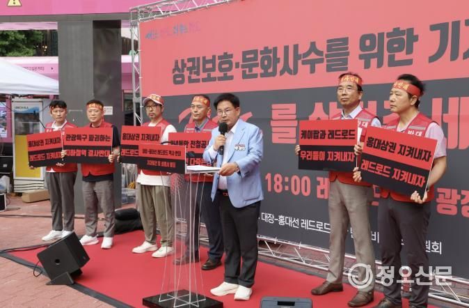 기자회견은 홍대에서 오랫동안 활동해온 예술인 강병수 씨의 사회로 진행됐으며, 이어 박강수 마포구청장을 비롯해 상인 대표, 지역 주민 대표, 예술인 대표가 차례로 반대 성명을 발표했다.
