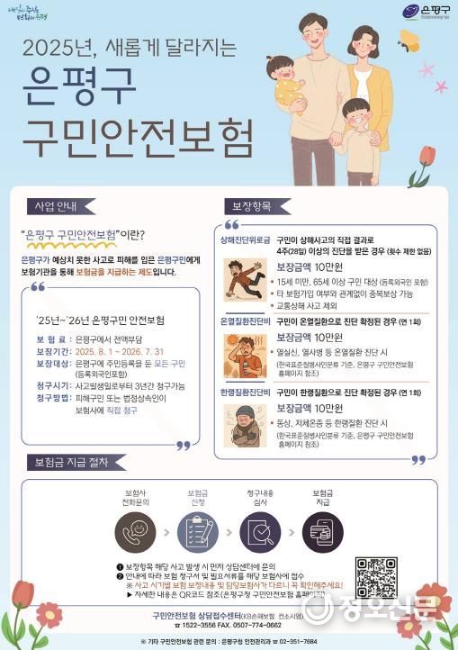 2025년 8월 1일부터 2026년 7월 31일까지 1년간 운영되는 구민안전보험은 사고가 발생한 당일에 은평구에 주민등록이 돼 있다면, 사고 발생일로부터 3년 이내에 보험금 청구가 가능하다.