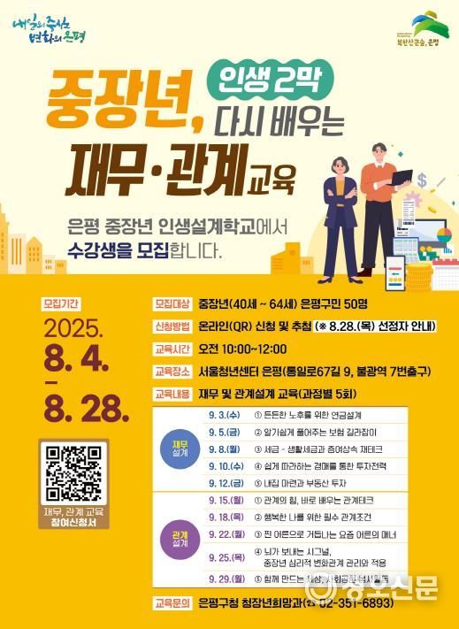 이번 ‘중장년 인생설계학교’에서는 재무설계, 관계설계 강좌가 진행된다. 교육 신청은 8월 4일부터 28일까지다. 모집 대상은 40세부터 64세까지의 은평구민으로 분야별 25명, 총 50명을 모집하며 추첨을 통해 교육생을 선정한다.
