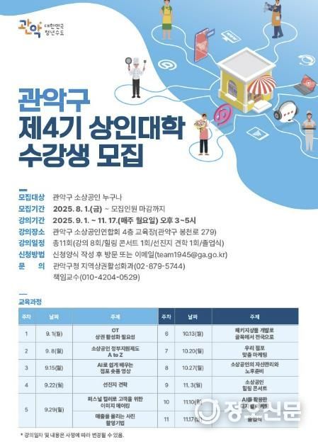 모집은 8월 1일부터 시작되고, 모집 인원은 총 40명으로 관악구 소재 소상공인이면 누구나 신청할 수 있다. 제4기 관악구 골목상권 상인대학 신청에 대한 자세한 사항은 관악구청 홈페이지(뉴스소식▷새소식▷관악소식)를 확인하거나 관악구청 지역상권활성화과에 문의하면 된다.