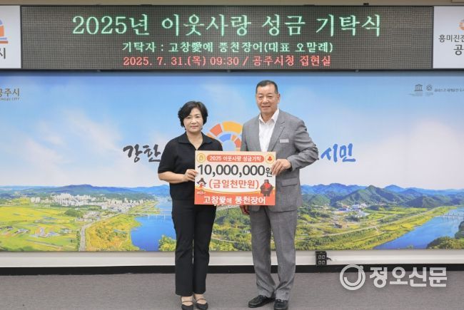 정오신문 관리자 기자 | 공주시는 지난 31일 시청 집현실에서 고창愛애 풍천장어(대표 오말례)로부터 이웃돕기 성금 1천만 원을 기탁받았다고 밝혔다.