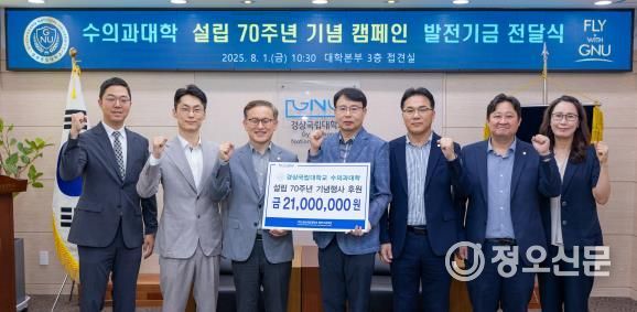정오신문 관리자 기자 | 경상국립대학교 수의과대학이 설립 70주년 기념행사를 준비하면서 발전기금 모금 캠페인을 펼처, 8월 1일 오전 대학본부 3층 접견실에서 발전기금 전달식을 개최했다.