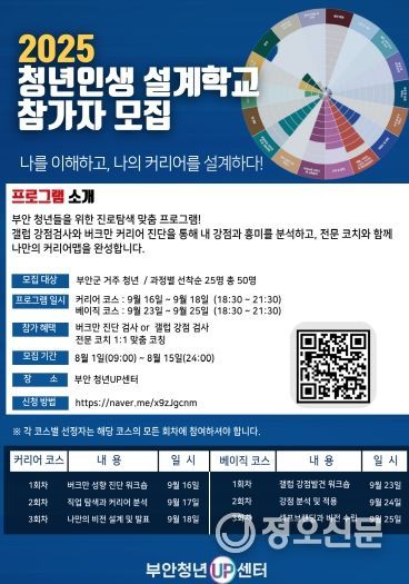 정오신문 관리자 기자 | 부안군은 지역 청년들의 자기이해와 진로설계를 지원하기 위한 '2025 부안 청년 인생설계학교' 참가자를 8월 1일부터 8월 20일까지 모집한다.