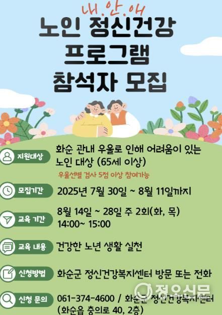 정오신문 관리자 기자 | 화순군은 보은병원에 위탁 운영 중인 화순군정신건강복지센터에서 오는 14일 노인 정신건강 프로그램 ‘내안愛’를 개최한다고 밝혔다.