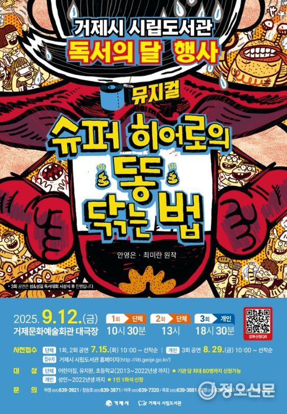 정오신문 관리자 기자 | 거제시 시립도서관은 오는 9월 12일 금요일 거제문화예술회관 대극장에서 9월 독서의 달을 맞이하여 어린이 뮤지컬 ‘슈퍼 히어로의 똥 닦는 법’ 공연을 개최한다고 밝혔다.