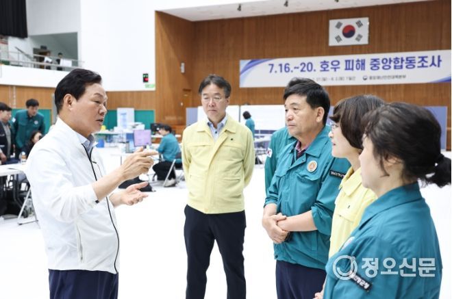 박완수 도지사는 2일 오전, 진주시 문산실내체육관에 마련된 중앙재난피해합동조사단을 찾아 집중호우 피해 조사 상황을 점검하고, 관계자들을 격려했다.