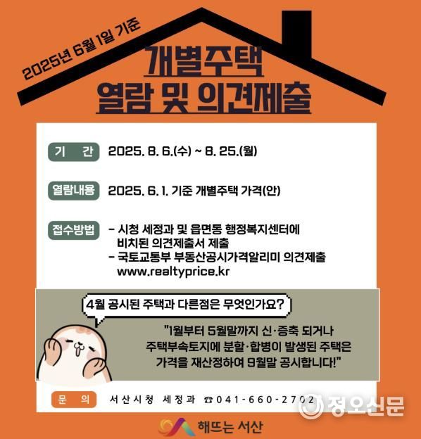 정오신문 관리자 기자 | 충남 서산시는 2025년 1월부터 5월까지 준공된 단독주택, 토지 분할·합병 등 변경 사항이 있는 개별 주택 200호의 공시가격을 산정했다고 밝혔다.