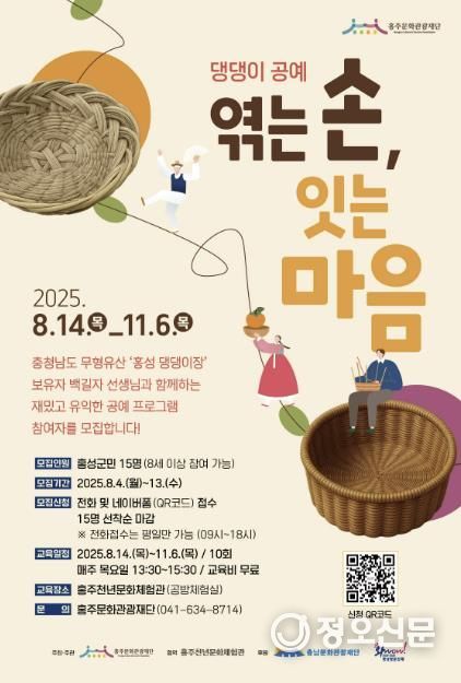 정오신문 관리자 기자 | 홍주문화관광재단이 전통 공예 활동 기반의 문화예술교육프로그램인 ‘엮는 손, 잇는 마음’의 참여자를 오는 13일까지 모집한다고 밝혔다.