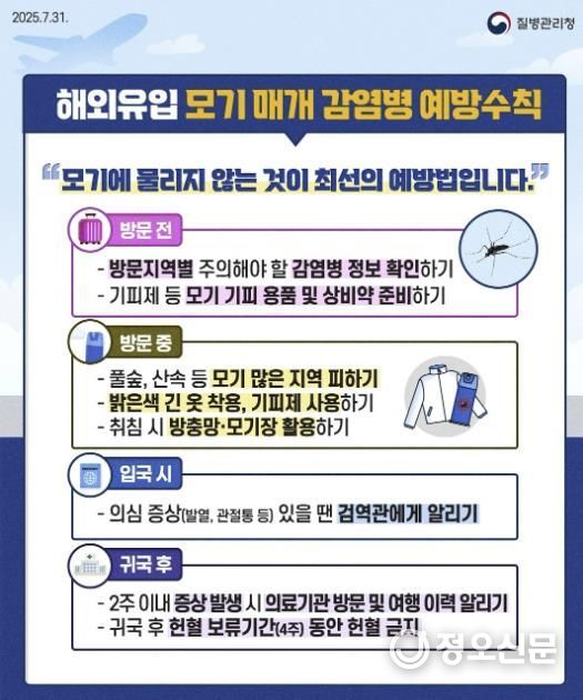 2013년 첫 환자 확인 이후 현재까지 우리나라에서 치쿤구니야열 감염자는 총 71명으로 모두 해외에서 감염된 후 국내에 유입된 사례로, 해외체류 시 예방수칙 준수를 당부한다. ▲밝은색 긴 팔 상·하의 착용 ▲주기적인 모기기피제 사용 ▲풀 숲 및 산 속 가급적 피하기 ▲방충망 구비 숙소 생활하기이다.