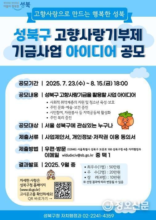 정오신문 관리자 기자 | 서울 성북구가 고향사랑기금을 활용할 다양한 사업 아이디어를 찾기 위해 ‘고향사랑기부제 기금사업 아이디어 공모’를 실시한다.