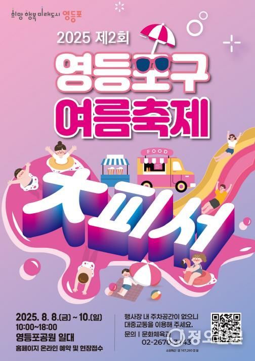 구는 이번 행사 외에도 15일부터 17일까지 신길근린공원에서 ‘도심 속 팝업 물놀이장’을 운영한다. 에어바운스(물놀이터), 물총대전과 마술쇼 등 가족 단위 프로그램이 다채롭게 구성돼, 어린이와 함께하는 여름 나들이 장소로 제격이다. 신길근린공원 팝업 물놀이장은 사전예약자 우선 입장제로 운영된다.