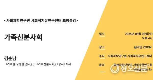 정오신문 관리자 기자 | 경상국립대학교 사회과학연구원(원장 송원근 경제학부 교수)은 8월 6일 오후 4시 김순남 가족구성권연구소 대표를 초청해 ‘가족신분사회: 포스트 호주제와 젠더정치’라는 주제로 초청강연회를 개최한다.