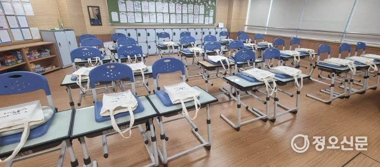 아무도 없는 교실 책상 위에는 개인별로 정성껏 포장된 교과서 에코백이 놓였다.
