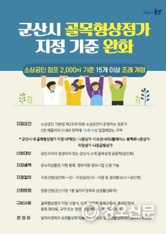 시는 최근 ‘군산시 골목형상점가 지정에 관한 조례’ 개정을 통해 지정 기준을 기존 2,000㎡ 이내 면적에 소상공인이 운영하는 점포 상업지역 25개 이상, 비상업지역 20개 이상 밀집에서 15개 이상으로 밀집 기준을 완화했다.