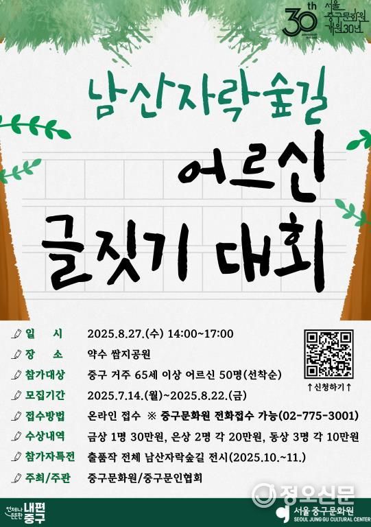 정오신문 관리자 기자 | 서울 중구가 오는 27일 오후 2시부터 약수동 쌈지공원에서 '남산자락숲길 어르신 글짓기 대회'를 개최한다.