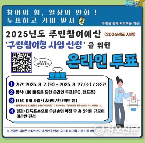 정용래 유성구청장은 “이번 온라인 투표는 주민의 자발적인 참여를 통해 지역 현안을 해결해 나가는 중요한 정책 결정 과정”이라며 “투표 결과를 예산에 반영해 지역 사회의 실질적인 변화로 이어지도록 하겠다”라고 말했다.