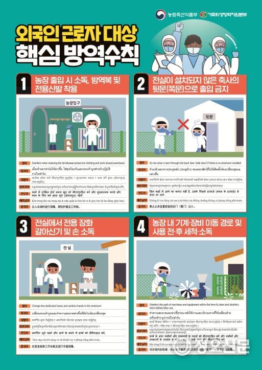 정비된 외국인 근로자와 고용 농장주를 대상으로 다국어로 된 방역수칙 홍보 리플릿 배부 및 문자 발송, 외국인 근로자용 영상 등을 활용하여 방역 교육을 실시하고, 아프리카돼지열병 등 가축전염병 현장 방역 점검에서 외국인 근로자 고용 농장에 대해 외국인 근로자 신고 사항과 방역관리 등을 중점 점검할 방침이다.