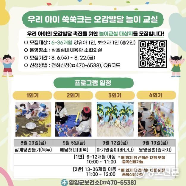 정오신문 관리자 기자 | 영암군이 이달 6일부터 ‘오감발달 놀이교실’ 참여 영유아와 보호자를 모집한다.