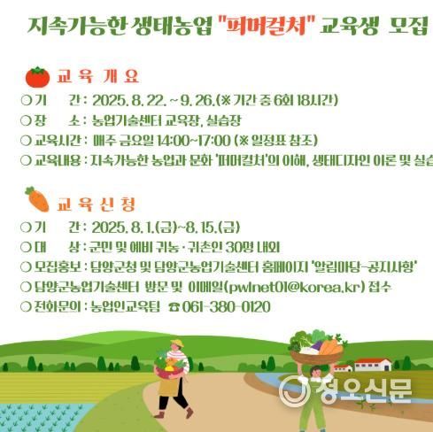 정오신문 관리자 기자 | 담양군은 기후위기 시대에 대응하고 지속가능한 생태농업을 실현하기 위해 ‘퍼머컬처(Permaculture) 교육’을 오는 22일부터 진행한다.