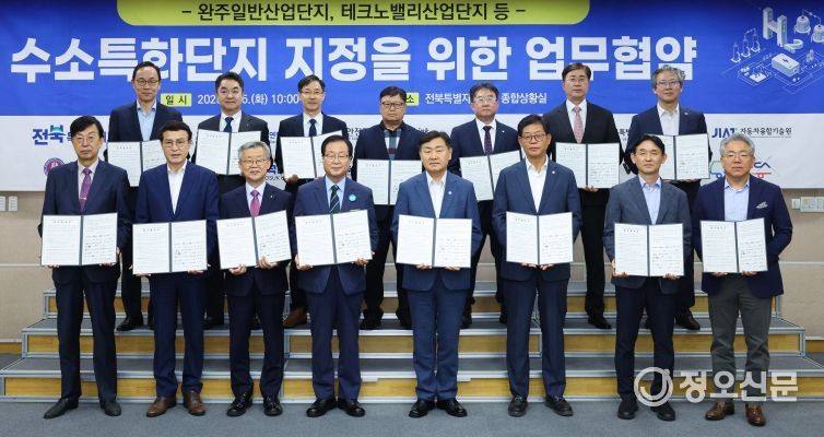 도는 5일 도청 종합상황실에서 완주군, 현대자동차 전주공장, 한국수소연합, 전북대 등 16개 기관과 완주 수소특화단지 지정 공모 대응을 위한 업무협약을 체결했다.