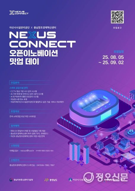 정오신문 관리자 기자 | (재)충남창조경제혁신센터는 지역 공공 인프라 운영 전문기관인 아산시시설관리공단과 함께 ‘2025 Nexus Connect 오픈이노베이션 밋업 데이’를 개최하고, 수요기술에 부합하는 스타트업을 오는 8월 5일부터 9월 2일까지 모집한다.